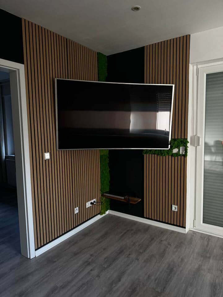 Wohnzimmer mit Entertainment-Bereich: Entspannt euch beim Fernsehen auf unserem 65-Zoll Curved TV, inklusive Netflix, Disney+, Amazon Prime und Zattoo.